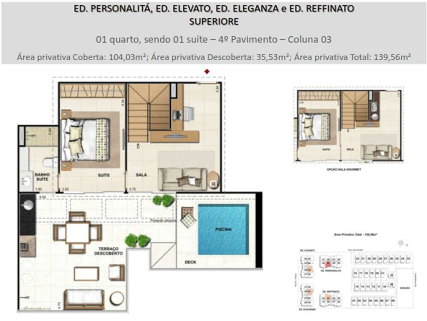 Superiore – Coberturas dúplex de 4 quartos, all suites, e 3 quartos, sendo 2 suítes, lavabo no pavimento superior, piscina e churrasqueira convencional, todas com dois estacionamentos e com até 172m².