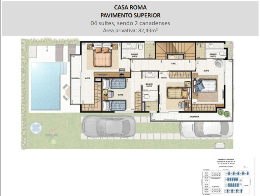 Casa Roma – 4 quartos sendo 2 suítes e 2 suítes canadense, Sótão, lavabo, Jardim exclusivo entregue com Piscina e Churrasqueira à gás e 3 estacionamentos, com até 306m².