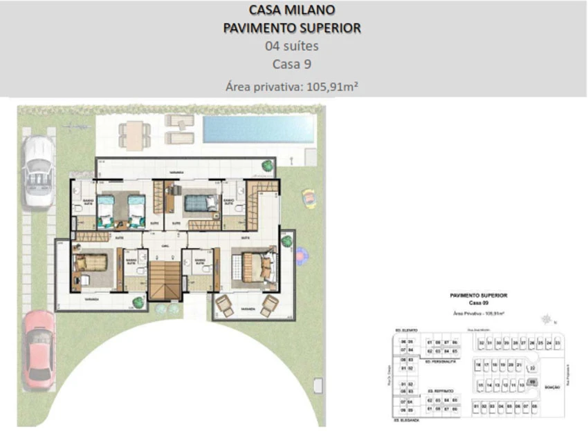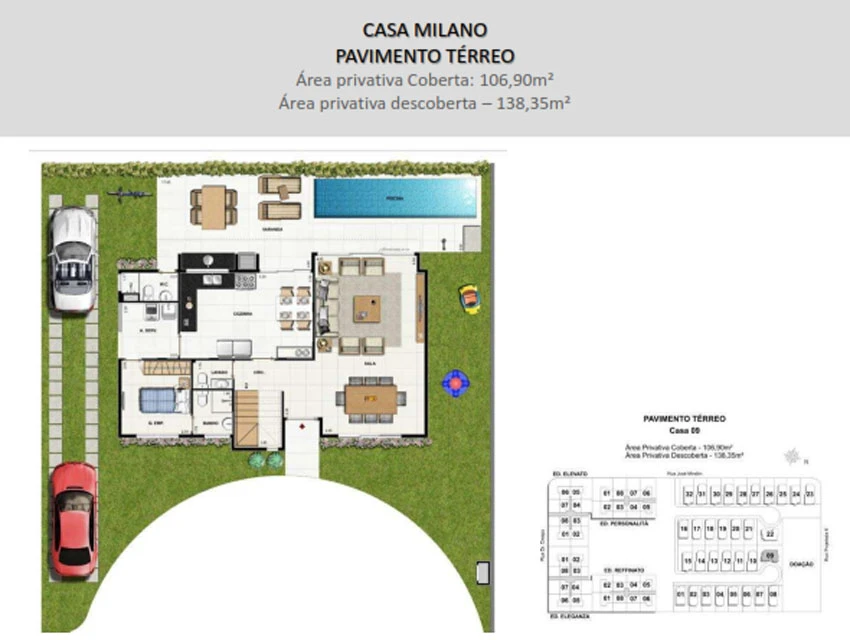 Casa Milano – 4 quartos sendo 4 suítes, Sótão, lavabo, Jardim exclusivo entregue com Piscina e Churrasqueira à gás e 3 estacionamentos, com até 404m².